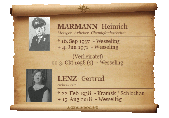 Ahnentafel mit 4 Generationen ![]() "Marmann" ist ein deutscher Familienname, der sich aus den Wörtern "Mar" und "Mann" zusammensetzt. "Mar" könnte von den Worten "März" oder "Marsch" abgeleitet sein und "Mann" bedeutet "Mann" oder "Mensch". Daher könnte "Marmann" möglicherweise einen Mann bezeichnen, der aus einer Region stammt, die im März besonders feucht und sumpfig ist, oder einen Mann, der aus einer solchen Gegend stammt. Seit jeher kenne ich von meiner Tante die Geschichte, daß der "Marmann" an einem Maar in der Eifel gelebt hat - der Mann am Maar eben. Es gibt auch mehrere Personen mit dem Nachnamen Marmann, die in verschiedenen Bereichen bekannt sind, wie z.B. Kunst, Wissenschaft und Unterhaltung. Zum Beispiel gibt es den deutschen Künstler Hans Marmann, den Mathematiker Horst Marmann und den Schauspieler Hans-Joachim Marmann. Im Folgenden sehen Sie den Stammbaum unterteilt in die vier Hauptlinien - Marmann, Weber, Lenz und Stuwe.